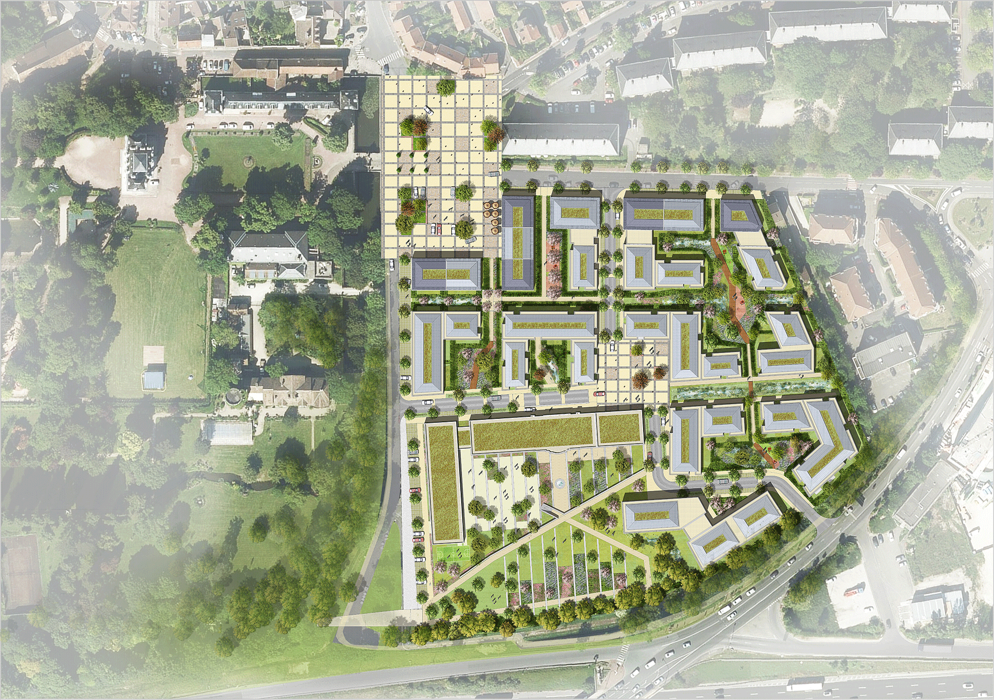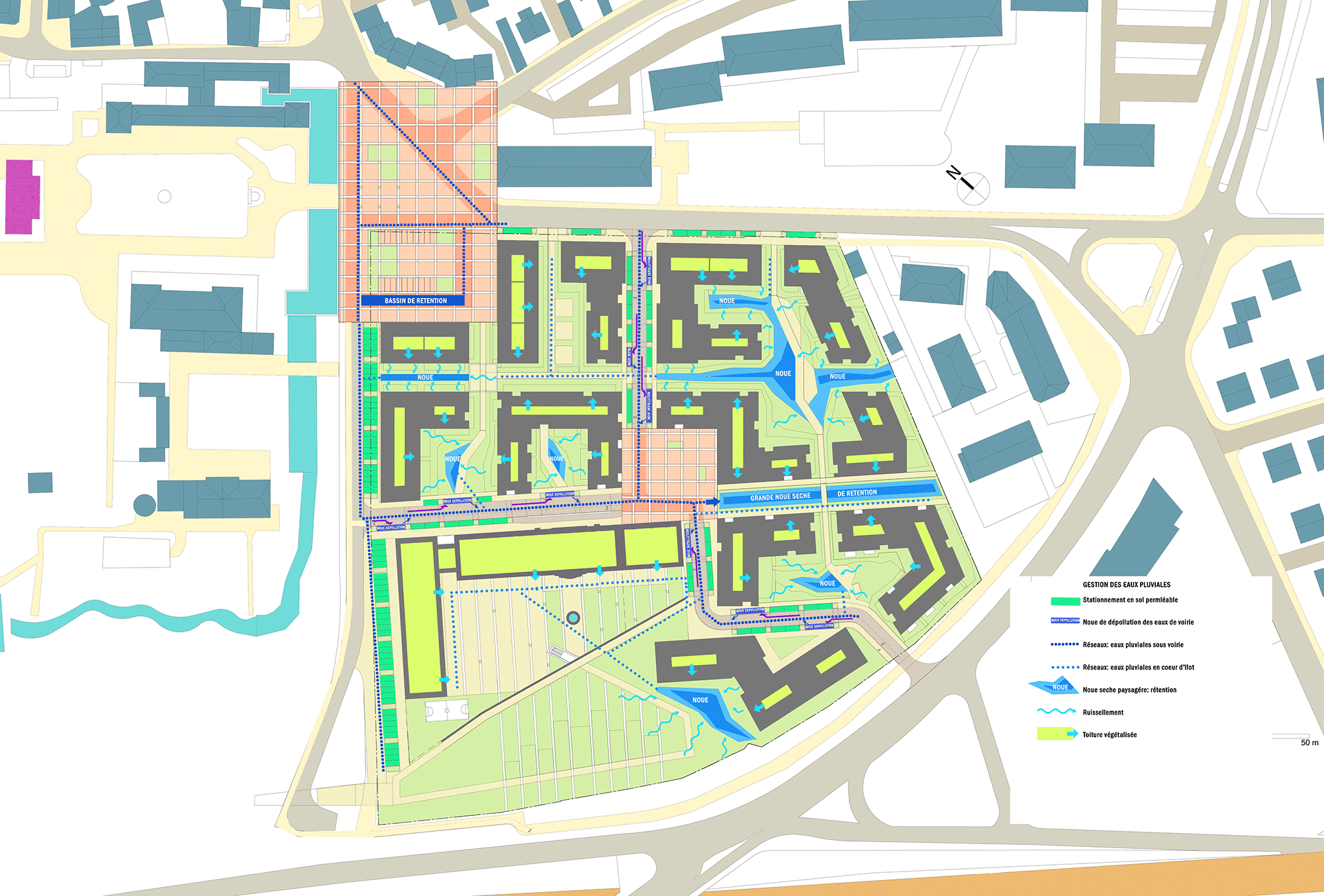 Requalification – En cœur d’îlot, une maille végétale trouve sa place dans l’agencement général du bâti. Elle est structurée autour des allées piétonnes bordées d’espaces verts collectifs et privés. Des aires de jeux et d’agréments s’articulent autour des cheminements. Afin de dynamiser les tracés, la largeur des allées varie sensiblement en fonction des séquences traversées – pontons, aires de jeux, jardins clos et espaces boisés.