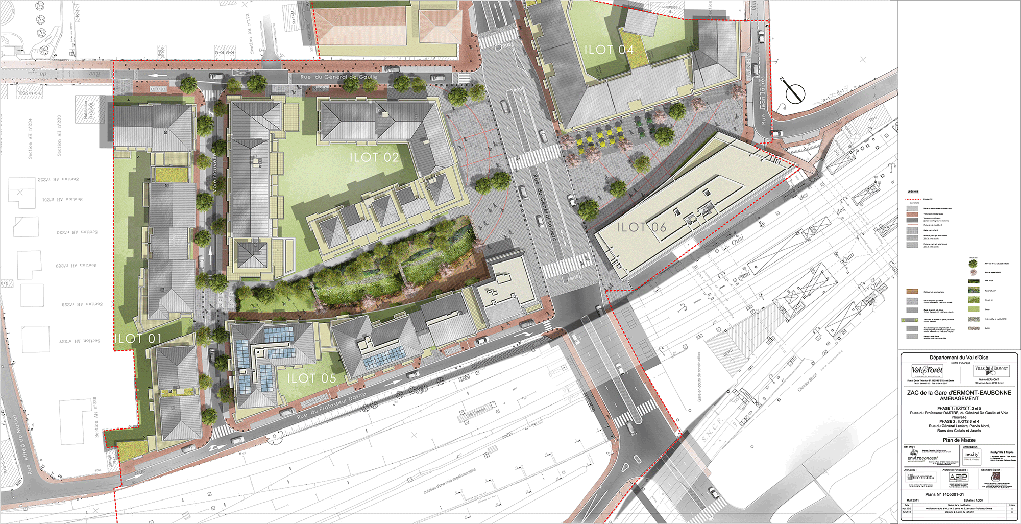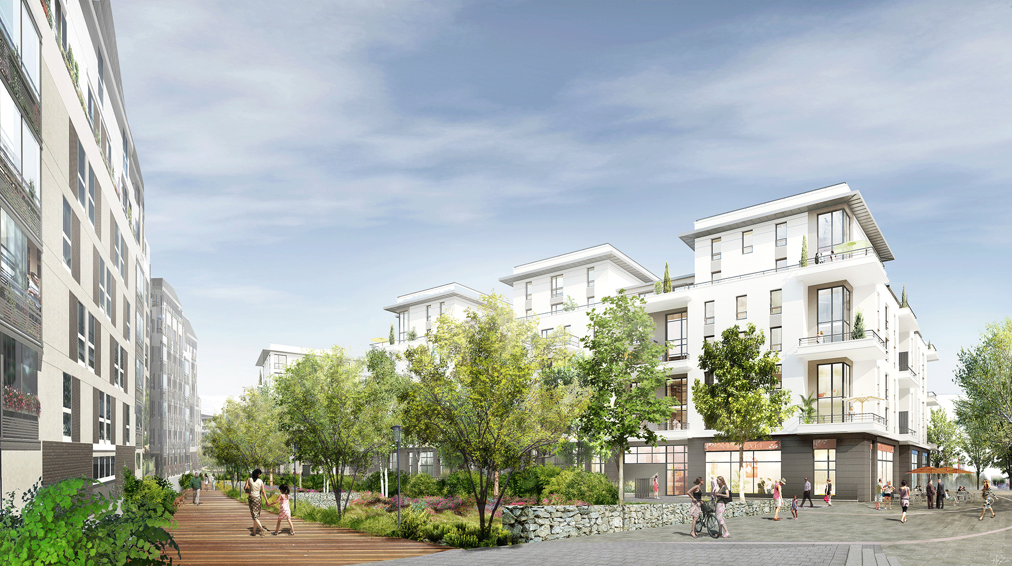 Des espaces publics verdoyants au sein d’un nouveau quartier – Projet de restructuration des espaces publics par la création d’un parvis, d’une placette et d’un square assurant la gestion des eaux pluviales ainsi que la reprise de deux voiries existantes en parallèle de la création de nouveaux logements, commerces et activités ainsi qu’une nouvelle ligne de TCSP.