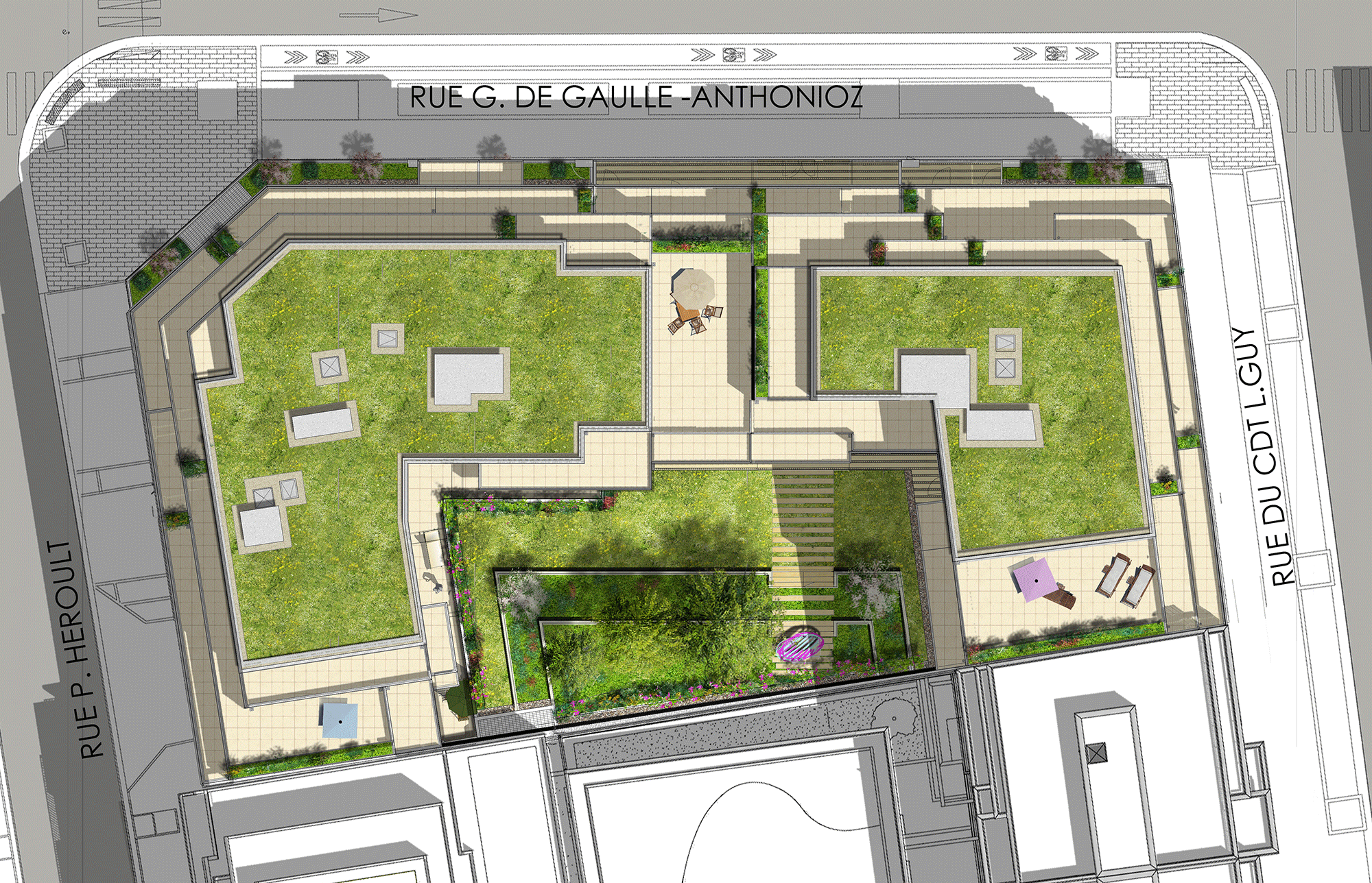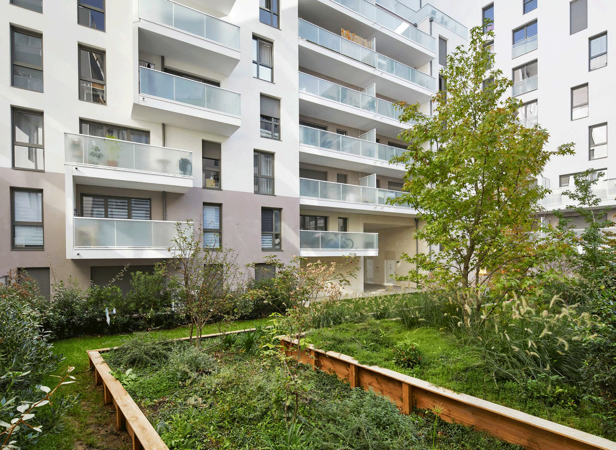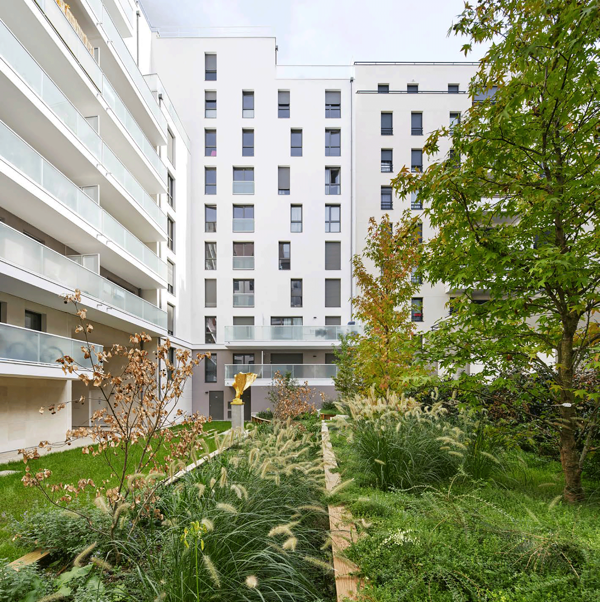 Un cœur d’îlot luxuriant visible depuis l’espace public. Un véritable jardin en gradins, émergeant d’une prairie, est donné à voir aux passants depuis la future rue Geneviève de Gaulle à travers un porche