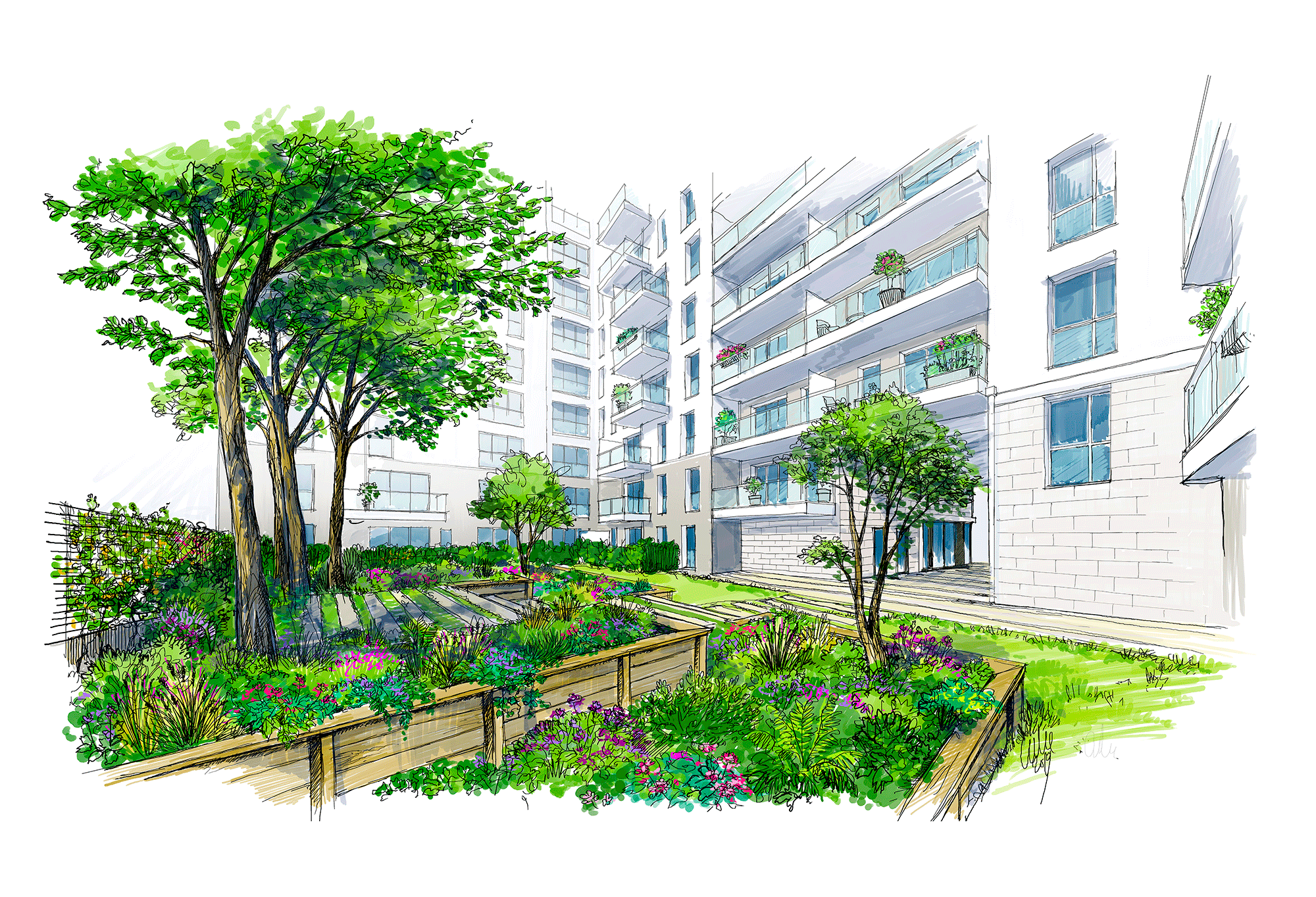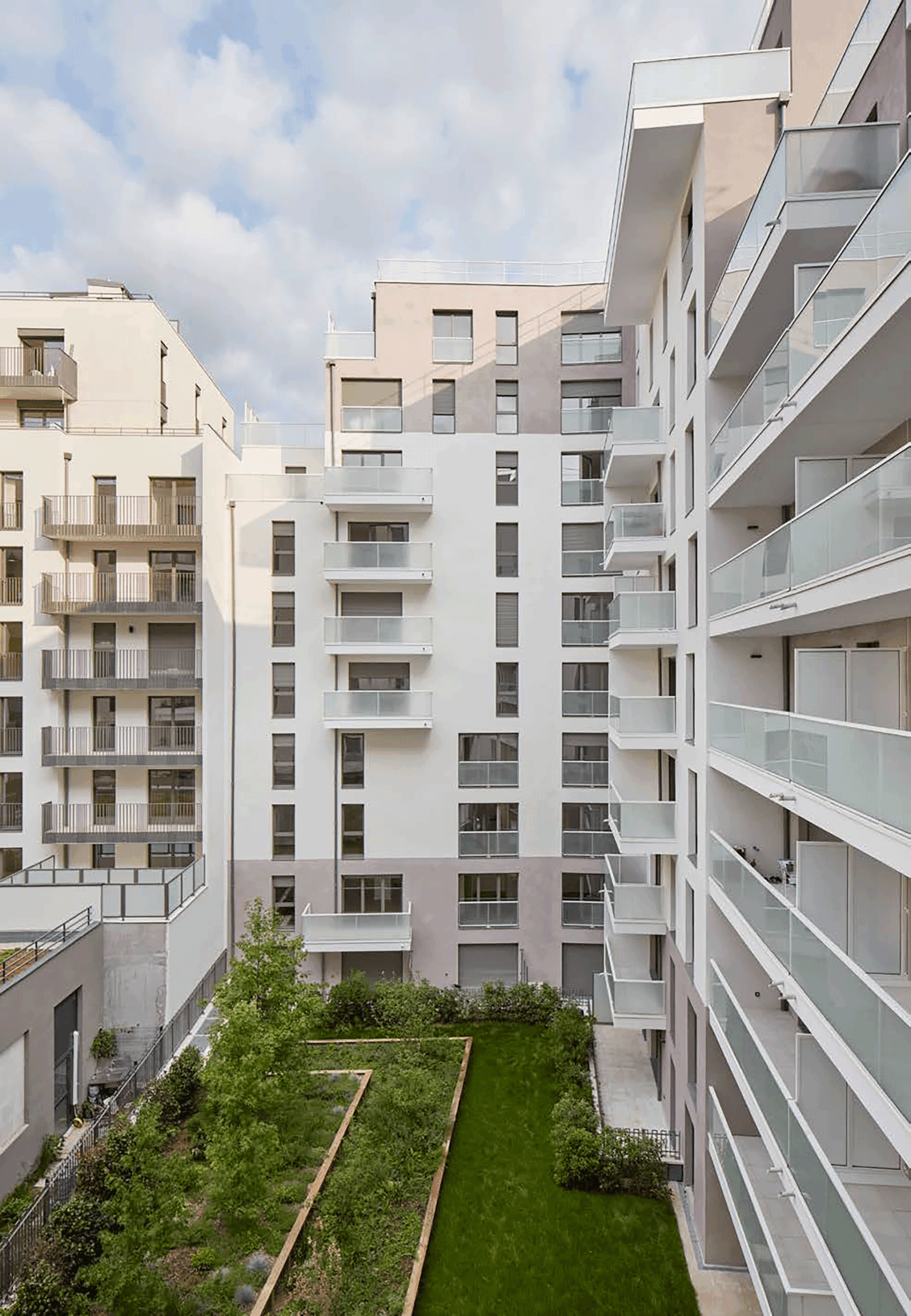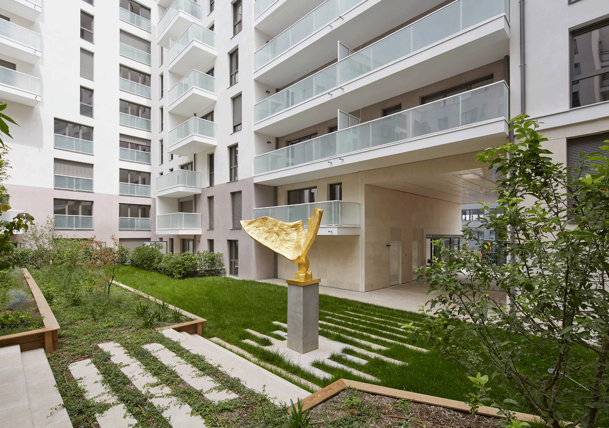 Un cœur d’îlot luxuriant visible depuis l’espace public. Un véritable jardin en gradins, émergeant d’une prairie, est donné à voir aux passants depuis la future rue Geneviève de Gaulle à travers un porche