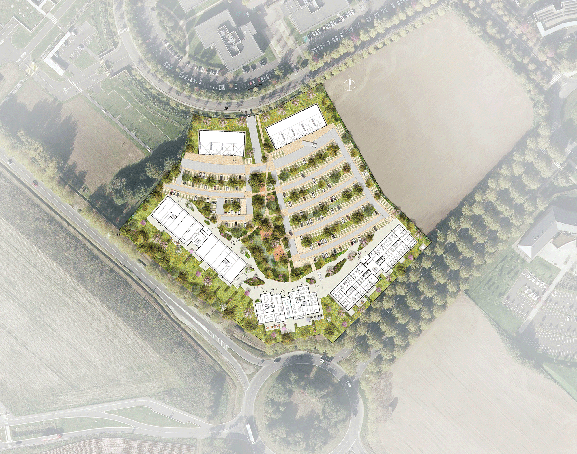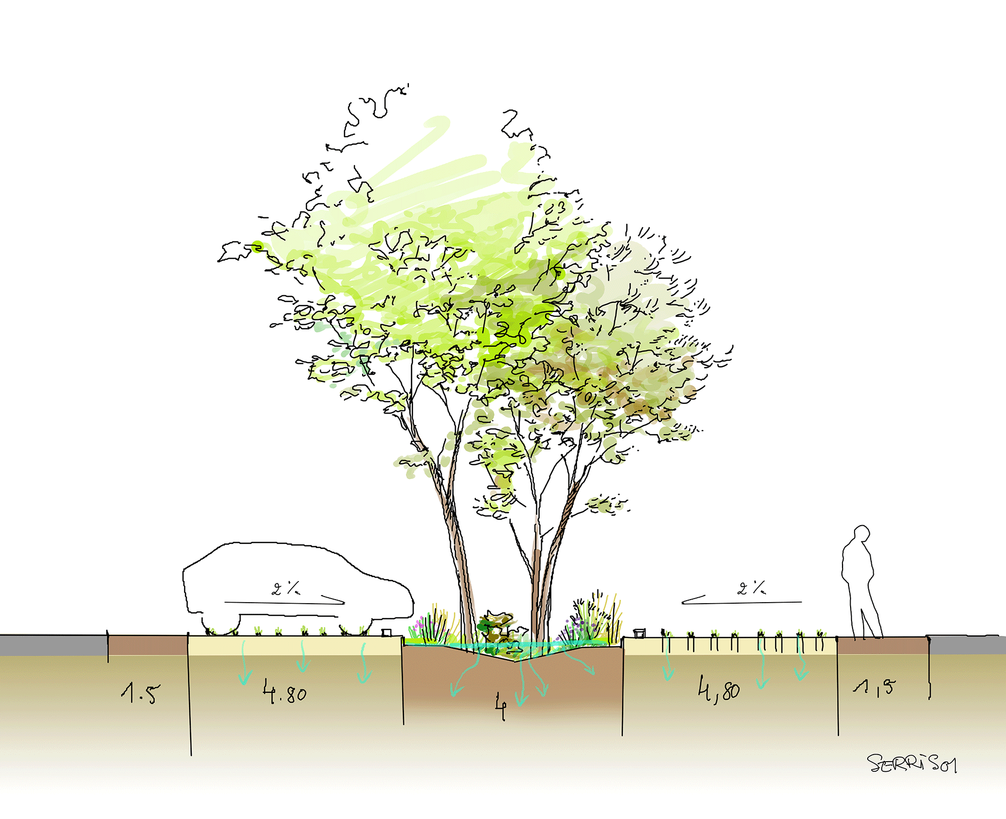 Un cœur d’îlot luxuriant visible depuis l’espace public. Un véritable jardin en gradins, émergeant d’une prairie, est donné à voir aux passants depuis la future rue Geneviève de Gaulle à travers un porche