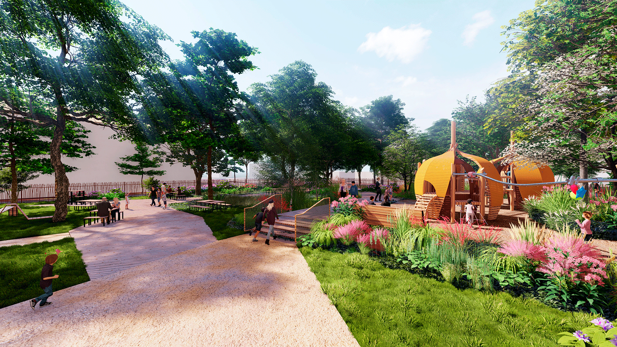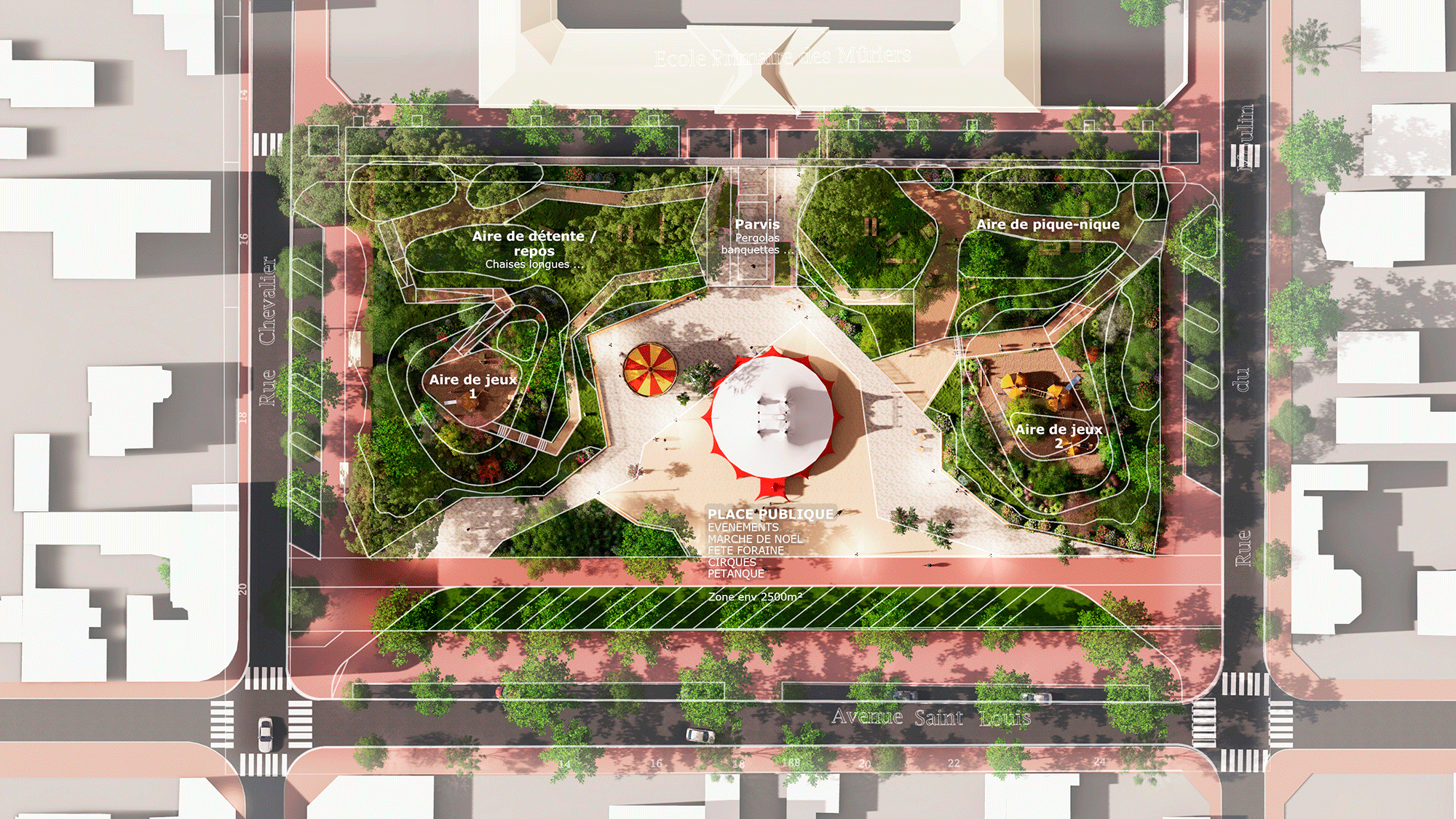Un cœur d’îlot luxuriant visible depuis l’espace public. Un véritable jardin en gradins, émergeant d’une prairie, est donné à voir aux passants depuis la future rue Geneviève de Gaulle à travers un porche