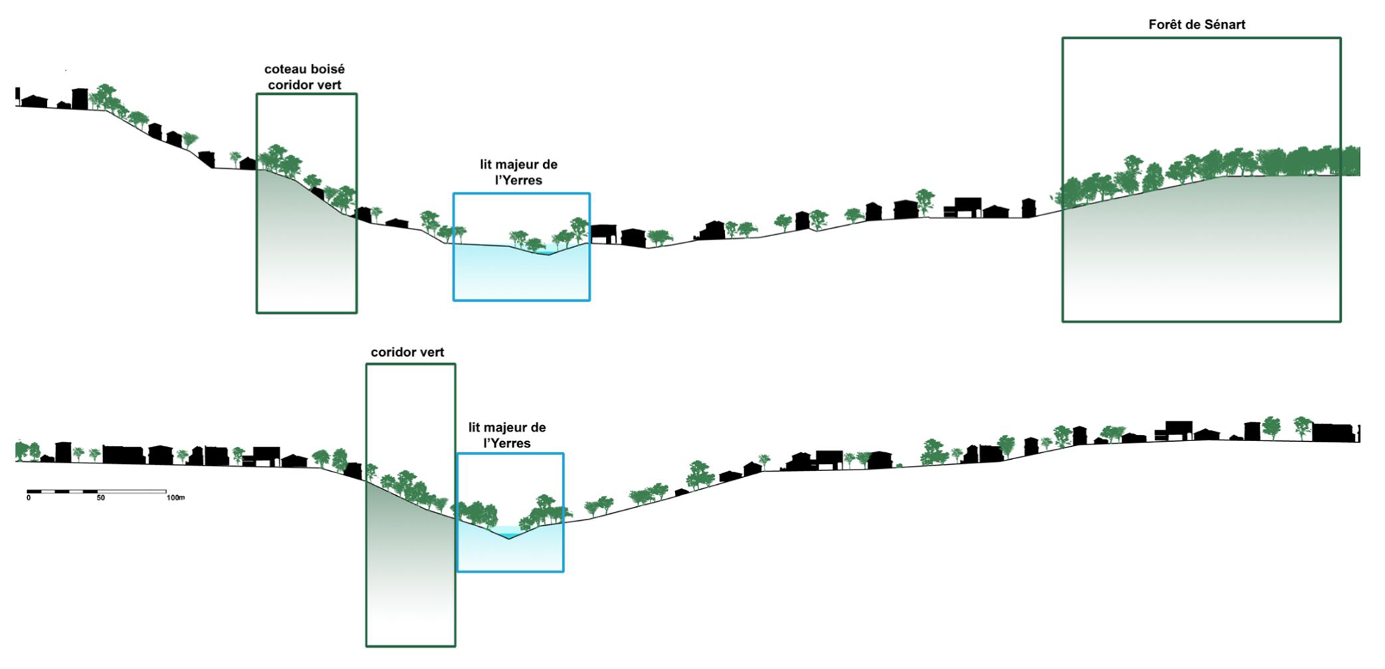 Compréhension d’un paysage rivulaire. Cette géographie singulière est génératrice de multiples paysages. Notre étude est basée sur le lit de la rivière, cependant la covisibilité entre la rivière et ses environs est primordiale.