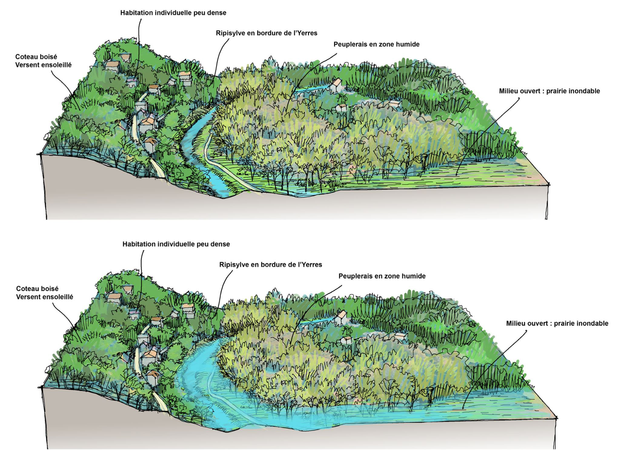 Ces interactions sont à la base d’une projection à l’échelle du grand paysage. Nous notons les ouvertures depuis les coteaux vers la vallée et le potentiel des espaces plans en fond de vallée.Définition des enjeux de corridors biologiques, milieux ouverts, naturalisation et aménagements des ripisylves…